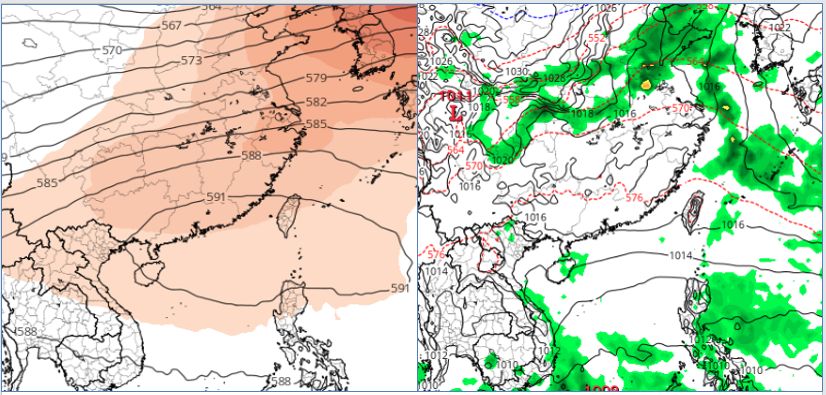 ▼9日20時歐洲模式(ECMWF)模擬12日8時天氣圖顯示,500百帕「副熱帶高壓」籠罩台灣附近(左圖);台灣無降水(右圖)。(圖/三立準氣象· 老大洩天機)