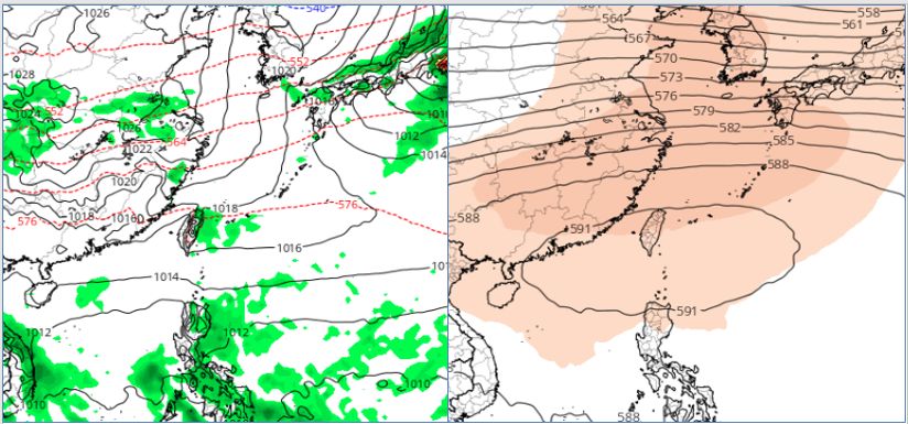 ▲10日20時歐洲模式(ECMWF)模擬13日20時地面圖顯示,東北季風增強,迎風面有降水(左圖);500百帕高空圖,「副熱帶高壓」仍籠罩台灣附近(右圖),顯示這波東北季風冷空氣並不強。(圖/三立準氣象· 老大洩天機)