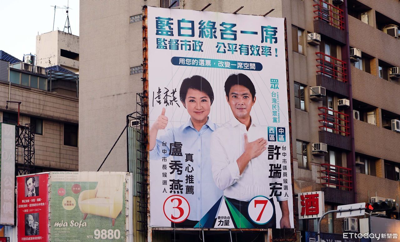 ▲許瑞宏政治主張獲台中市長盧秀燕支持,在街頭掛上2人合體看板。(圖/許瑞宏競選總部提供)
