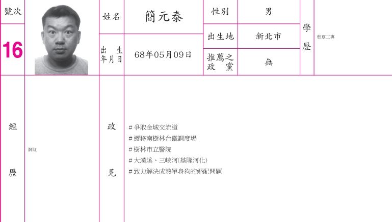 新北市第8選區(樹林、鶯歌、土城、三峽)無黨籍候選人簡元泰,現年43歲,畢業於華夏工專,經歷欄僅填「網紅」兩字。