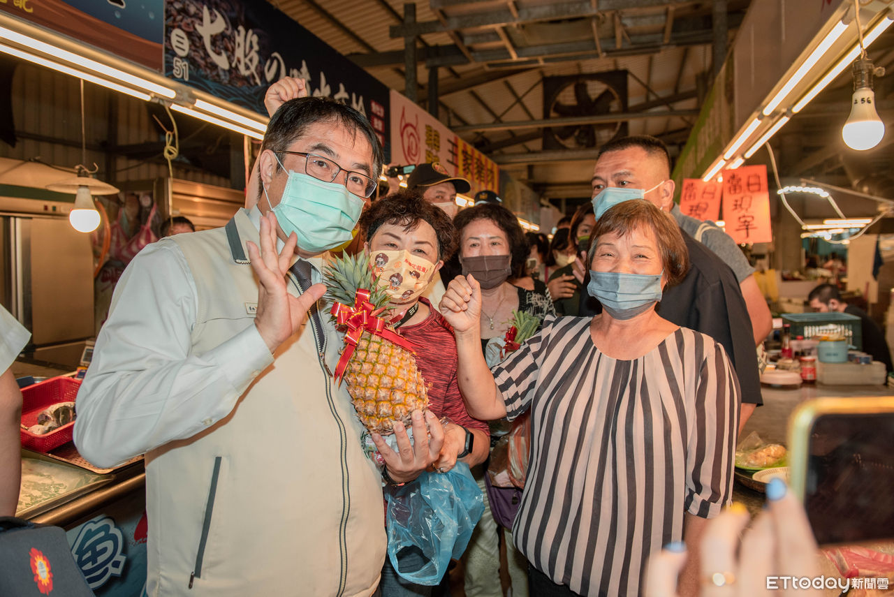 ▲台南市長黃偉哲現身黃昏市場拜票掃街,要求合照與簽名的民眾蜂湧而至,也展現出黃偉哲連任的超高人氣。(圖/記者林悅翻攝,下同)