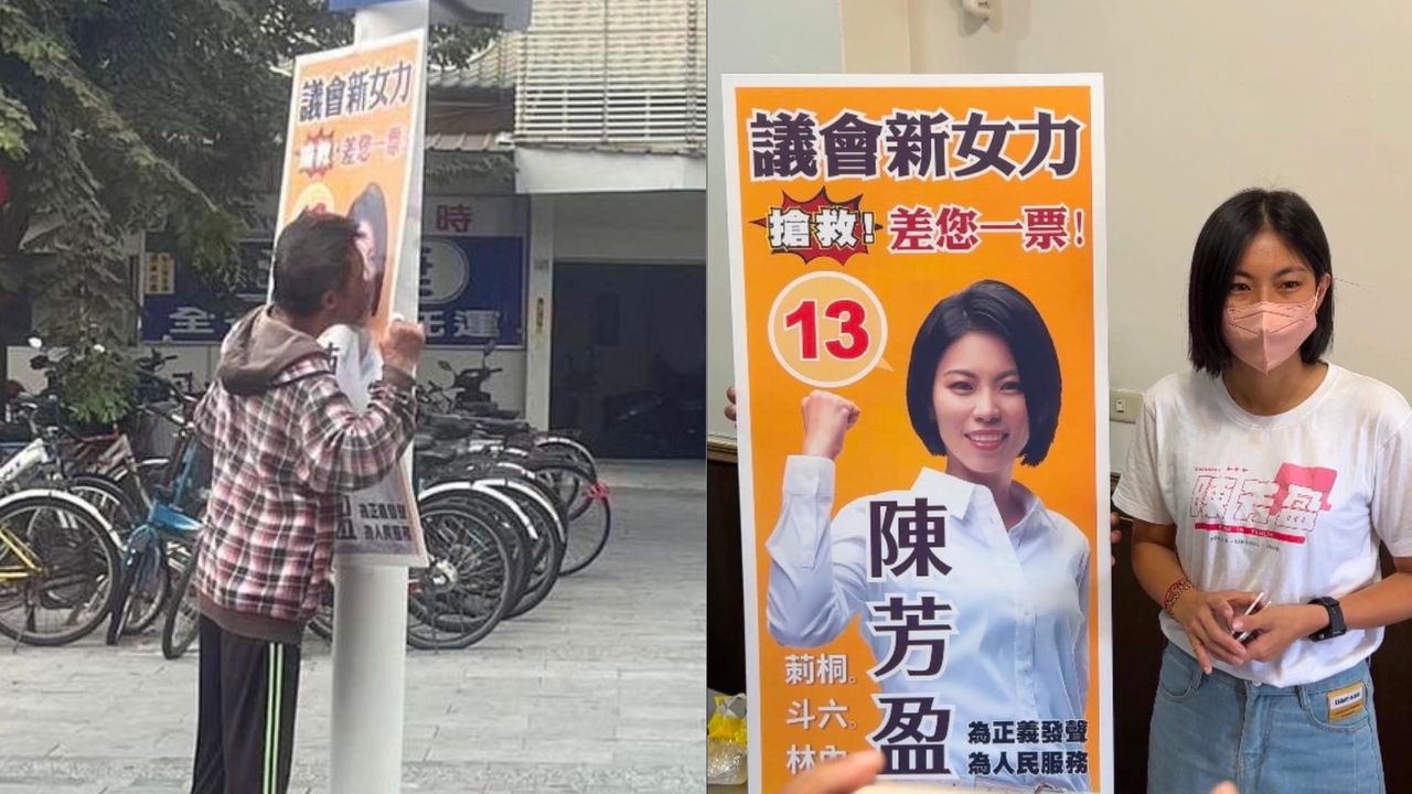 年底九合一大選將至,各候選人紛紛加緊腳步宣傳,在路上貼出競選廣告看板。有網友17日於臉書社團「路上觀察學院」上貼出一名男子當街親吻無黨籍雲林縣議員候選人陳芳盈競選看板的照片,此貼文一出立馬受到網友熱烈討論,更引出陳芳盈本人回應,「感謝大家的愛戴,深深感受到這位先生對我的熱情,如果喜歡看板,可以在26日投票後帶回去收藏。」