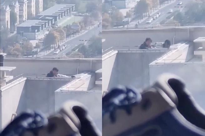 ▲中國一對男女在大樓頂活春宮被拍下。(圖/翻攝推特,下同)