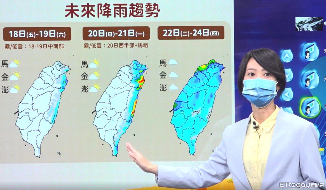 周日及下周一(11/20~11/21)東北風增強,將帶來水氣,謝佩芸表示,周日與今明兩天相比,降雨略多,東北部、東半部和大台北地區降雨增多,東北部雨勢變得更明顯,西半部依然是穩定天氣,僅周日西半部清晨要留意霧。
