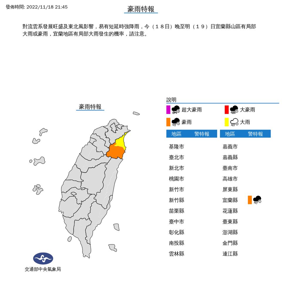今(18日)東北風稍增強,下半天迎風面降雨增多。中央氣象局晚間9點45分對宜蘭發布豪雨特報,受對流雲系發展旺盛及東北風影響,易有短延時強降雨,今晚至明(19)日宜蘭縣山區有局部大雨或豪雨,宜蘭地區有局部大雨發生的機率,提醒民眾注意。