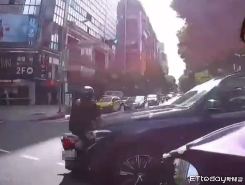 昨(18)日上午一名機車騎士行經台北市中山區林森北路、錦州街口,綠燈起步時右側卻突然衝出一輛闖紅燈的BMW休旅車,騎士剛起步車速不快緊急煞停,但左側一名快速通過的女騎士就當場遭BMW車頭擦撞倒地,目擊過程的騎士也忍不住用手指著肇事駕駛唸道「再闖紅燈嘛!」,並要女騎士趕快報警。