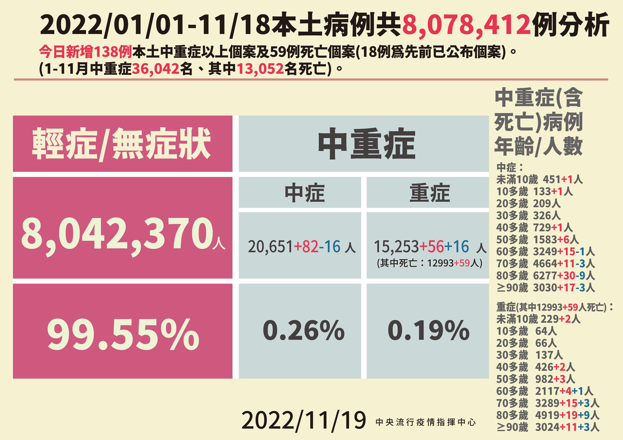 ▲指揮中心11/19公布本土病例分析及中重症統計。(圖/指揮中心提供)