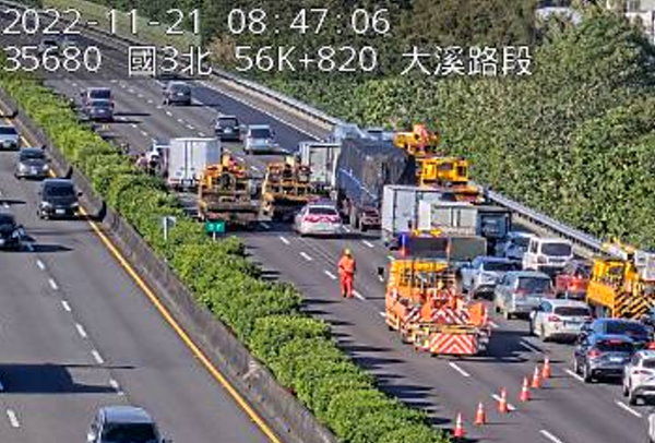 高公局表示,今天(21日)8時29分,國道3號南向57K、大溪路段,發生內2線5小客車+外線3小客車、1小貨車追撞事故,事故處理中,後方回堵2公里,請用路人小心駕駛。目前該路段時速「紫爆」,僅剩19公里。