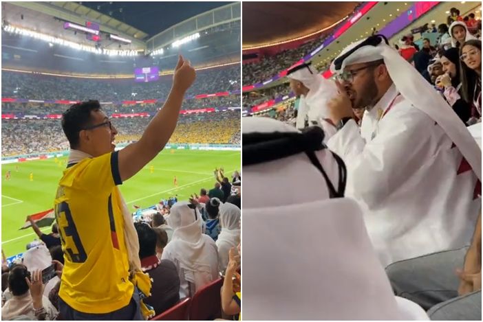 不過推特如今也開始流傳一段畫面,一名厄瓜多球迷慶祝其中一顆進球時,在看台區站起來,舉起手做出數錢的手勢,同時不斷詢問周邊看球的人「多少錢」,暗諷嘲笑卡達。但此舉惹惱坐在後方的卡達隊支持者,要求這名厄瓜多球迷閉上嘴巴坐下。
