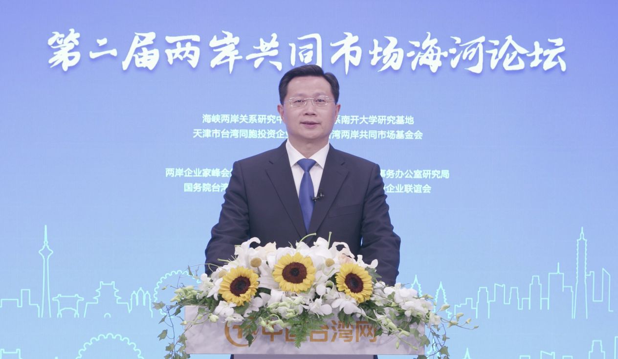第二屆「兩岸共同市場海河論壇」近日在天津舉辦。國台辦副主任潘賢掌發表影片致詞稱,中央台辦將一如既往支持天津深化對台交流合作,繼續助力天津成為廣大台灣同胞投資興業、生活發展的熱土。