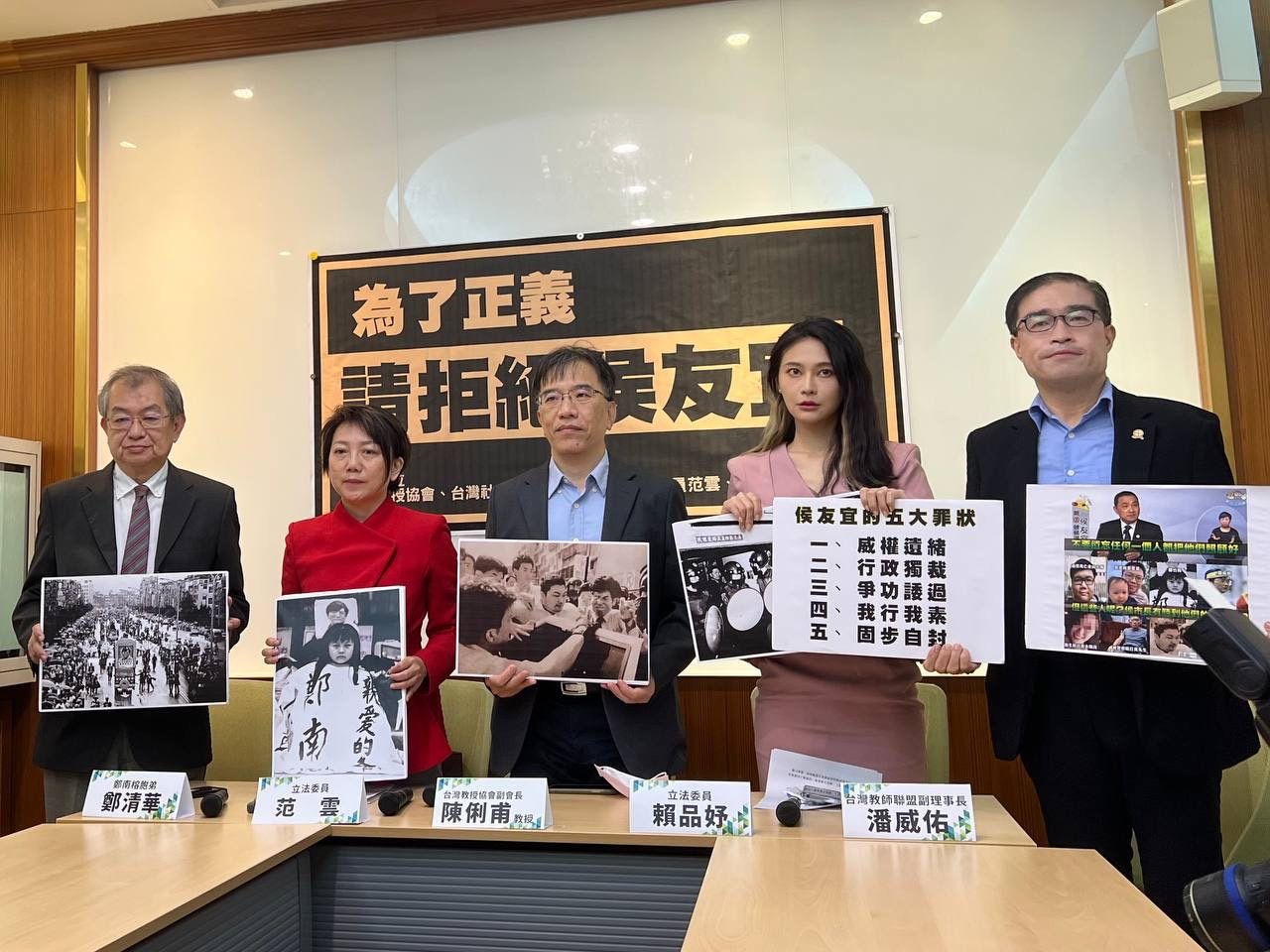 台灣教授協會、台灣教師聯盟、台灣社等本土社團今天上午在立法院舉辦「為了正義,請拒絕侯友宜」記者會,民進黨立委范雲、賴品妤應邀與會。