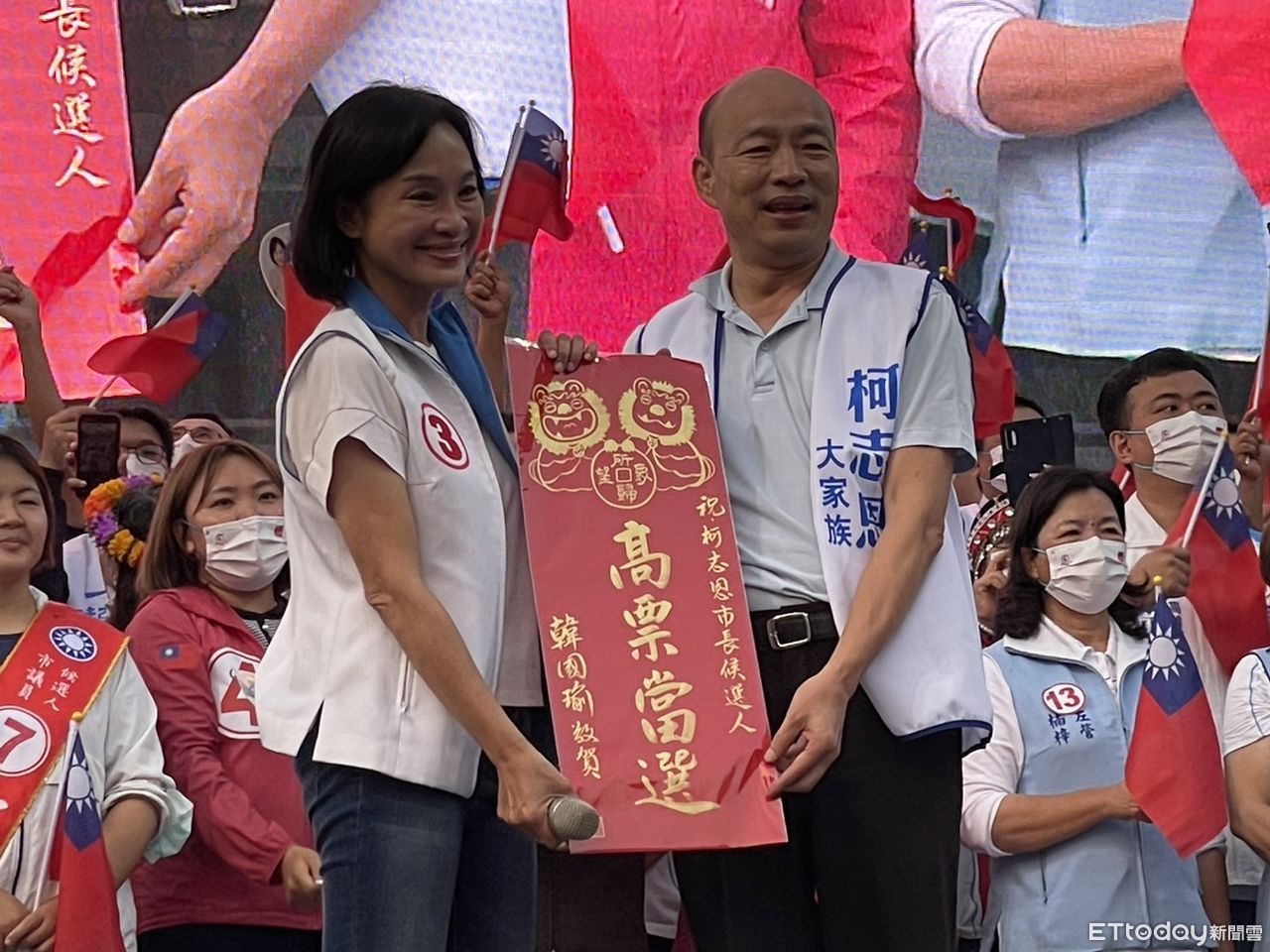 ▲柯志恩請來韓國瑜同台造勢,韓國瑜提出票投柯志恩可以「買一送三」、「陳其邁去接行政院院長」等口號。(圖/記者許展溢攝)