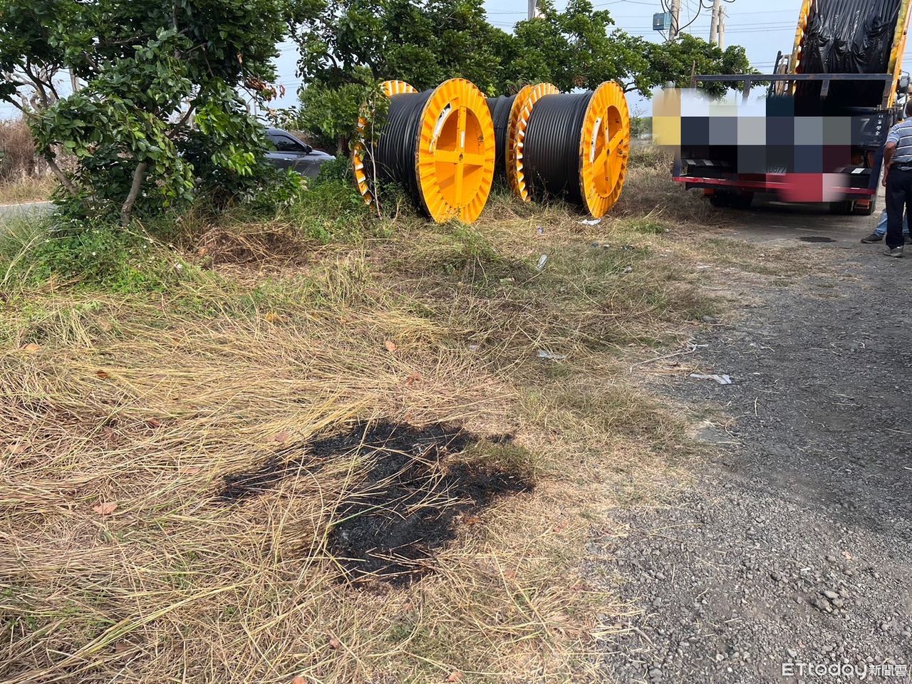 ▲台南市北門區下午發生1起吊車吊桿疑操作不慎感電事件,52歲陳姓吊車司機已無生命跡象,消防人員送醫搶救,「感電」現場草地呈焦黑狀。(圖/記者林悅翻攝,下同)