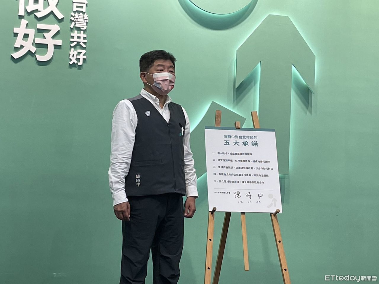陳時中今天上午提出5大承諾,包括:第一,用人唯才,不分任何黨派;第二,落實性別平權,任用年輕首長,組成跨世代團隊;第三,重現府會關係,以溝通化解歧異,以合作取代對抗;第四,重建「8萬大軍」台北市府公務員工作尊嚴,不為政治服務;第五,強化區域聯合治理,擴大與中央政府合作。