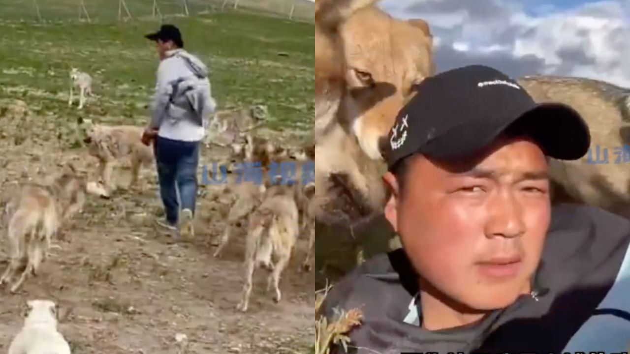 據《山海視頻》報導,相關影片顯示,該名男子走近大批狼群當中,不僅沒被攻擊,而且多匹狼跳起來想與其互動;男子躺在草地上,有3匹狼躺在身邊親舔、撒嬌磨蹭,關係十分親密。