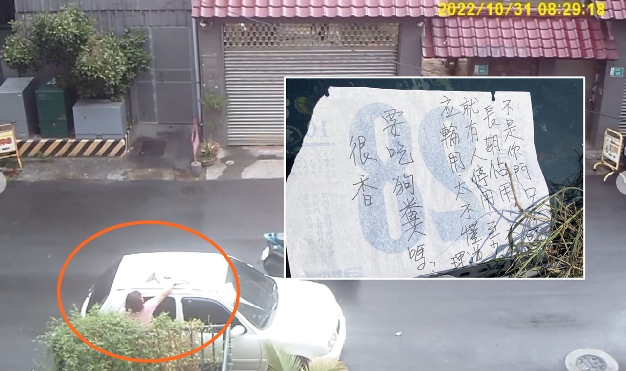 停車大作戰!台南新營區有民眾爆料,將自家小轎車停在租屋處門口,卻被鄰居大姐亂丟垃圾,還留下一張紙條寫「要吃狗糞嗎?很香」嗆聲,讓他超傻眼,氣得報警提告,並公布監視器畫面,網友看了紛紛驚呼「好變態的大嬸」、「支持提告」、「只能說你人太好」。