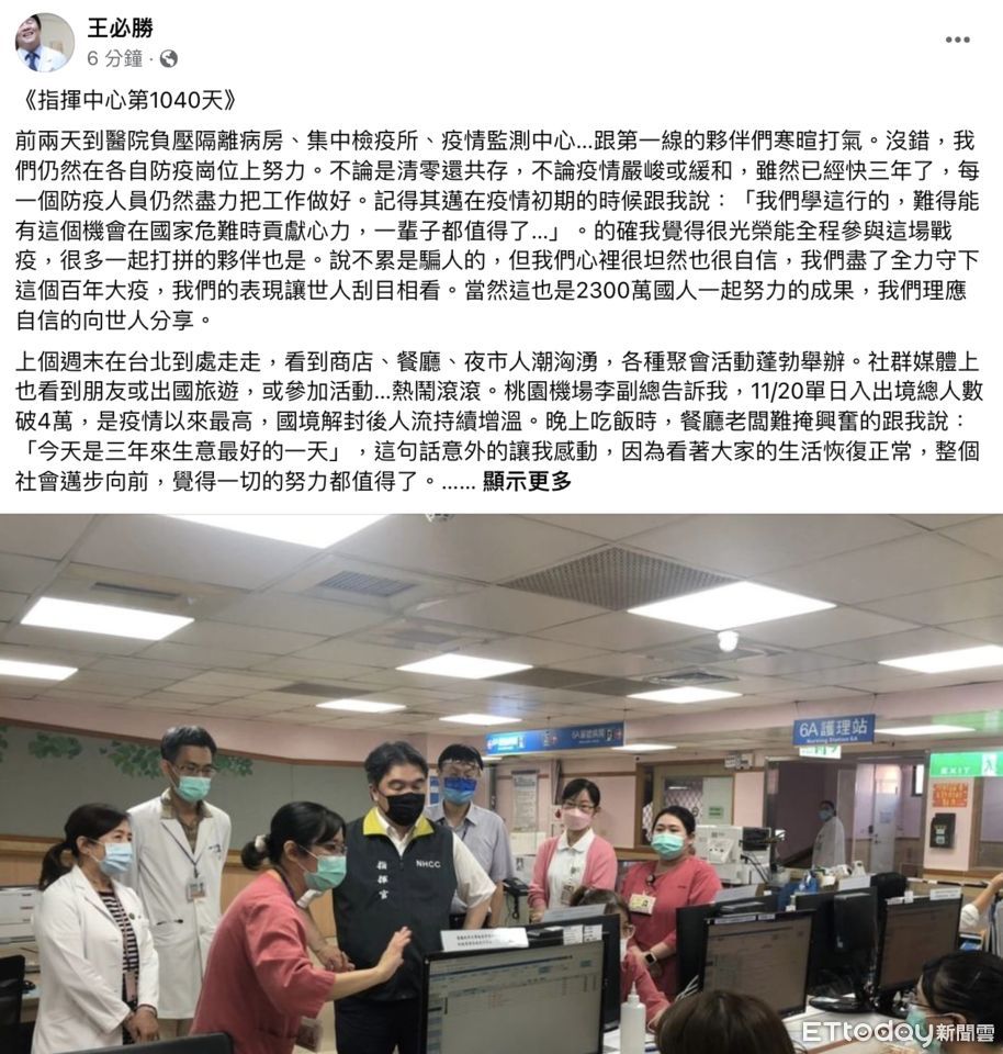 ▲指揮中心第1040天,王必勝發文。(圖/翻攝自王必勝臉書)