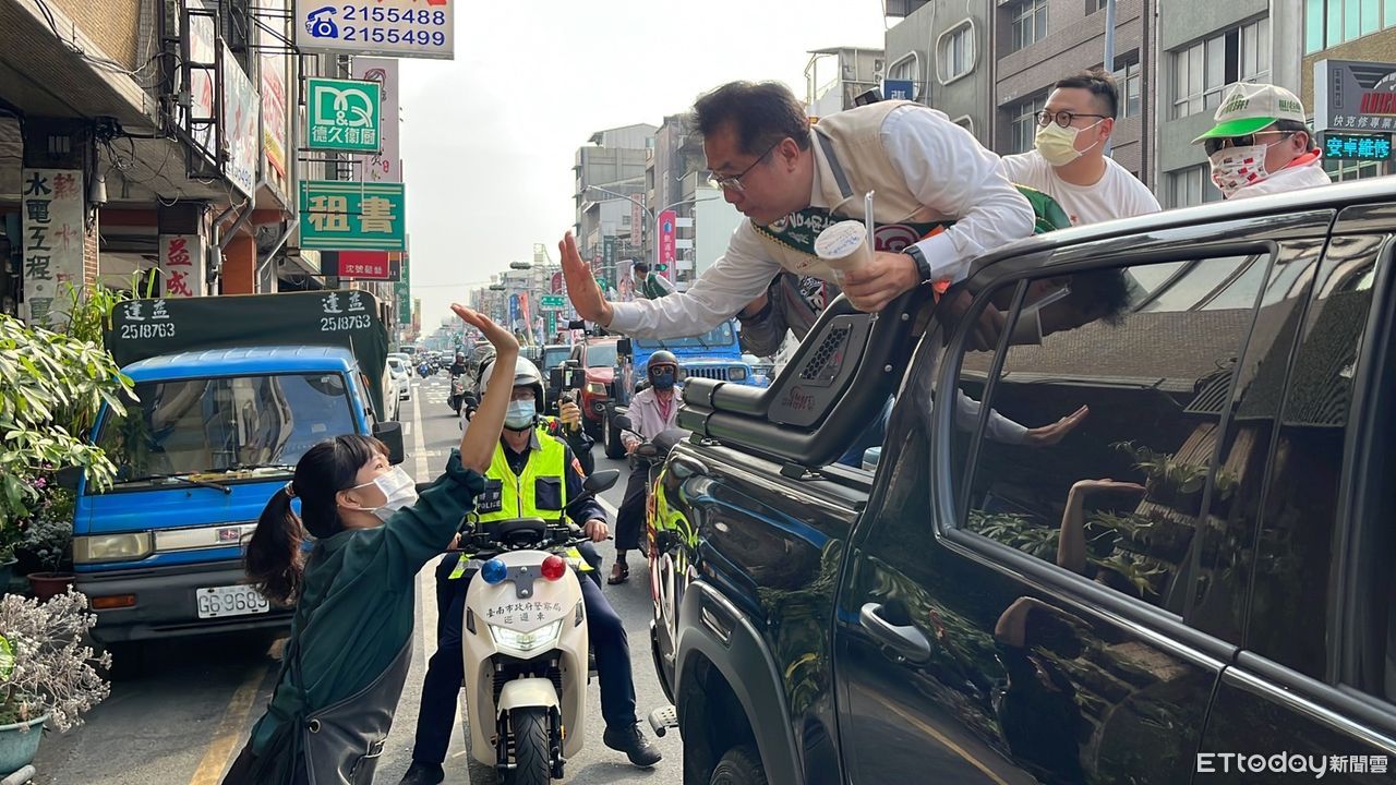 ▲台南市長黃偉哲車隊行經西門路的茶飲店時,一名熱情的店員雙手舉起珍珠奶茶,送給市長祝福,黃偉哲立即,彎腰接受店員的慰勞,並與店員擊掌說謝謝。(圖/記者林悅翻攝,下同)