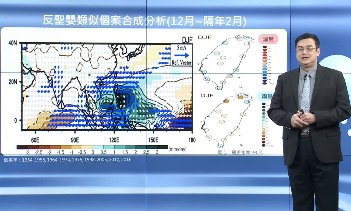 陳怡良表示,參考過去歷史個案,反聖嬰年有兩個明顯特徵,台灣會有溫度偏低,降雨偏少這樣的特徵,如果從電腦動力模式模擬,台灣未來冬季氣溫大約在正常範圍內,接近溫暖,雨量有偏少的訊號,雨量預測在偏少到正常的機率高。