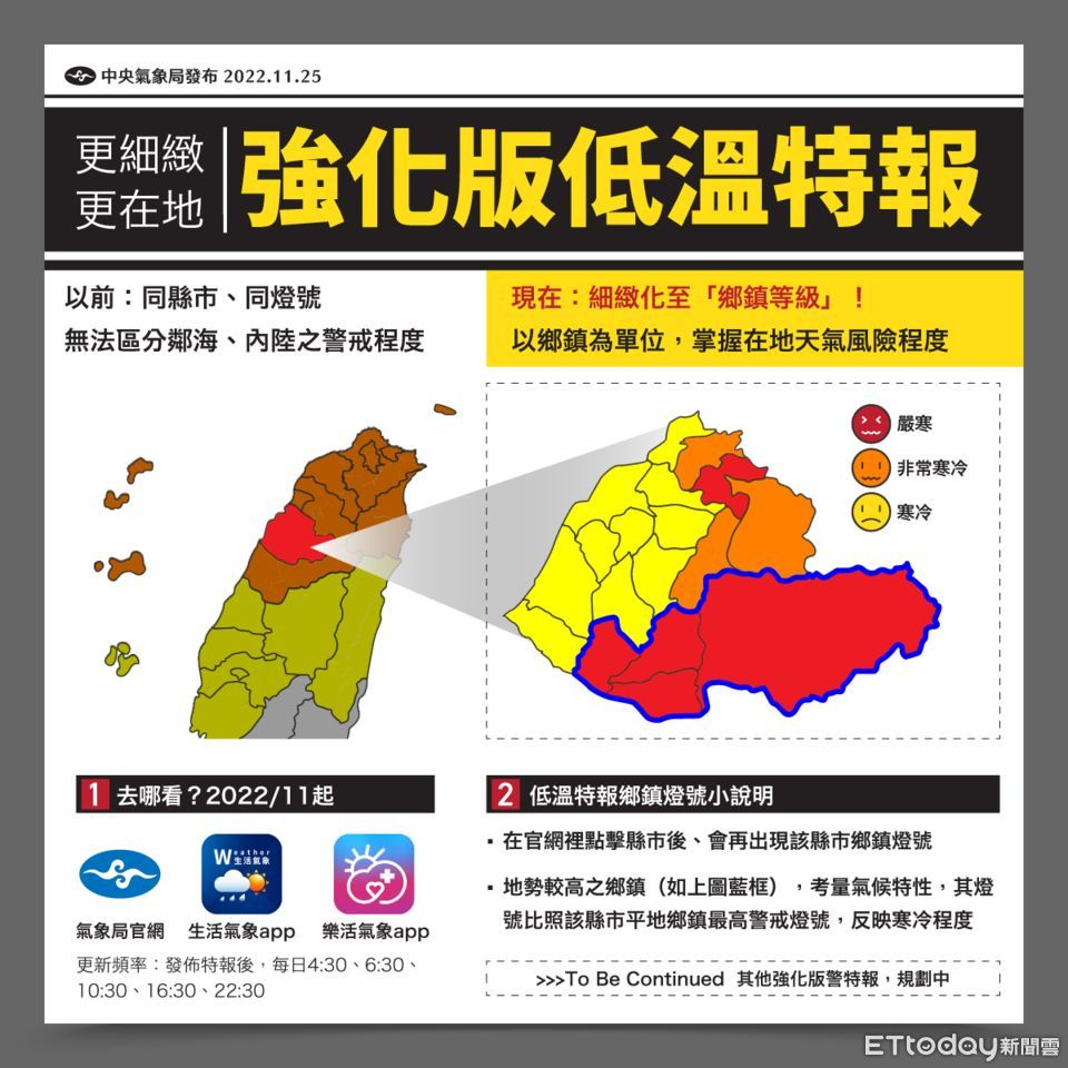 氣象預報中心副主任陳怡良表示,氣象局自11月1日開始將提供新服務,針對各縣市達到低溫燈號發布標準,過往提供一整個縣市低溫燈號,11月起將更細緻,還有鄉鎮燈號。