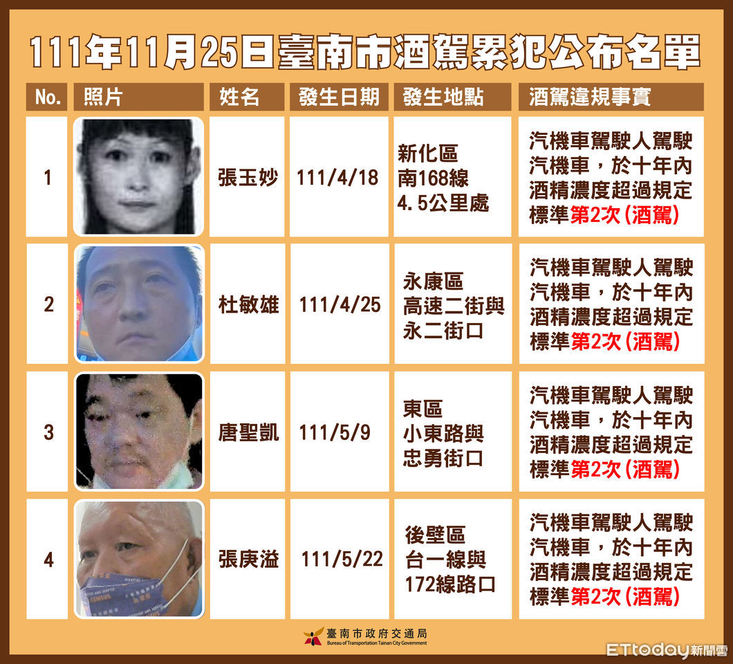 台南市公布第14批酒(毒)駕累犯名單,這次公布12名累犯違規人,累計公布83人,本次公布違規地點分別在新化區2名、永康區4名、東區2名、後壁區1名、歸仁區1名、新營區1名以及國道1號1名,交通局依法公布姓名、照片及違法事實等資訊。