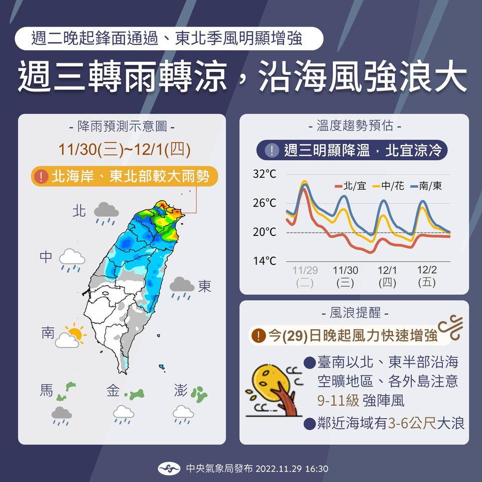 今晚到明日鋒面逐漸通過,加上東北季風漸漸增強,北部、東半部轉為短暫雨,中部以北、東北部、東部明顯轉涼,預計周四、五清晨北台灣將下探16度,直到周末天氣才會回暖。下周一又有一波較弱東北季風影響,北部、東半部高溫將會下降。
