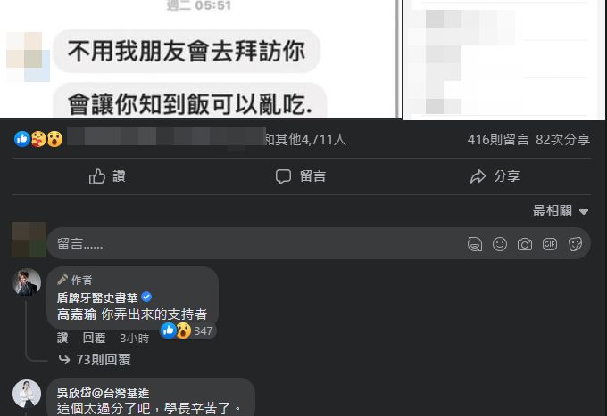 ▲牙醫史書華認為遭到私訊威脅,跟高嘉瑜有關。(圖/翻攝盾牌牙醫史書華)