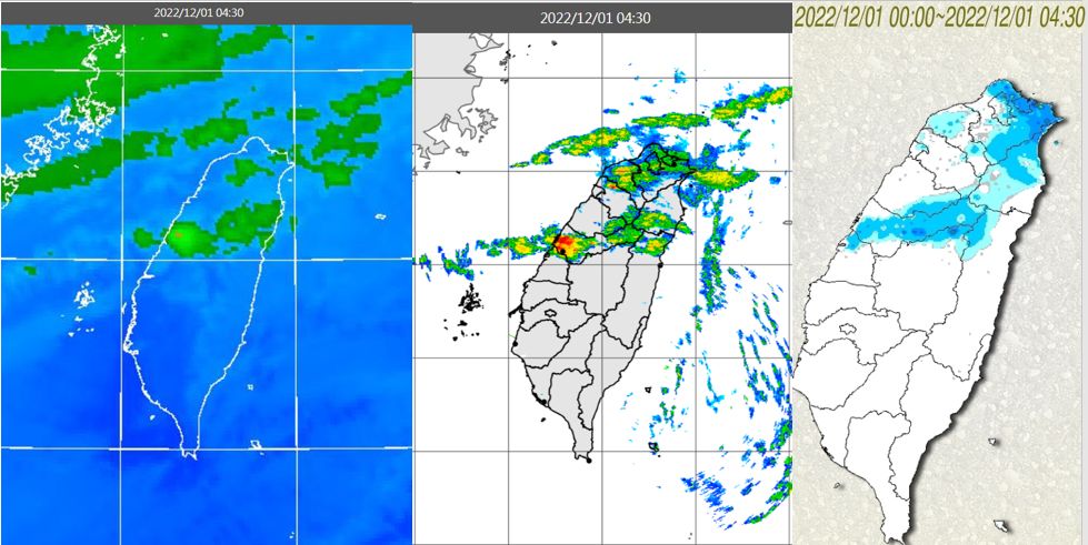 ▼左圖:1日4:30紅外線雲圖顯示,中部以北雲層較多。中圖:1日4:30雷達回波合成圖顯示,迎風面及中部皆有降水回波。右圖:1日4:30累積雨量圖顯示,中部以北局部降雨。(圖/三立準氣象· 老大洩天機)