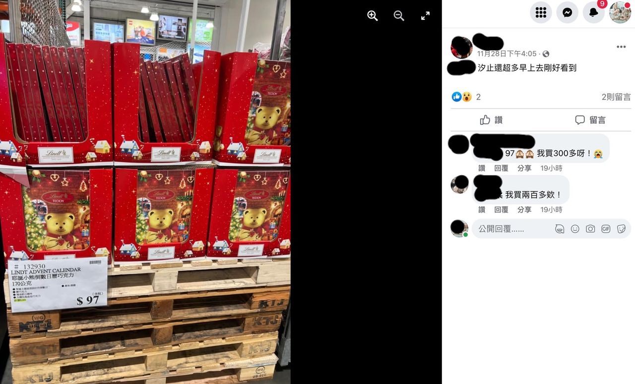 進入12月聖誕節慶氛圍濃!許多人早就準備好「聖誕倒數月曆」想要天天都有過節的感覺,其中美式賣場每年冬季都會推出的「耶誕小熊倒數日曆巧克力」更是熱銷單品,單價從開賣300多開始往下降,越接近聖誕節價格越低,近日降到97元引起熱議,網友說「10分鐘搶光」!