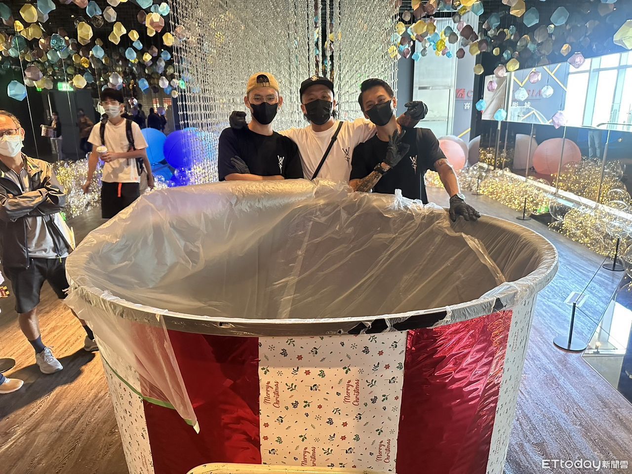 ▲3名超狂男子推著1600公升大桶子要來裝爆米花。(圖/記者許宥孺攝)