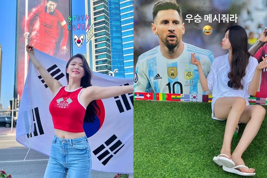 她5日就曬出自己進場看球的辣照,只見她穿著紅色的削肩短版緊身背心搭配牛仔褲,露出肩線和小蠻腰,還在身上披上國旗,在卡達街頭的孫興慜大型廣告前擺出高難度的「人體對折」姿勢,另外也分享南韓隊挺進16強後開心慶祝、南韓球迷集體應援的畫面。