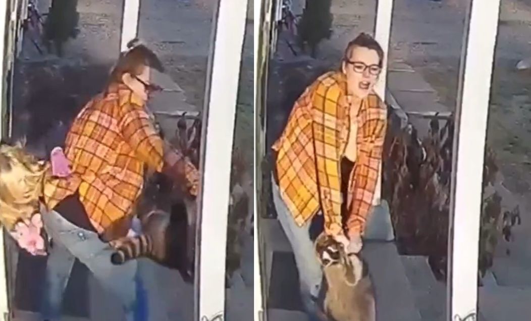 ▲女子大戰浣熊的畫面在網路上流傳。(圖/翻攝自Twitter)
