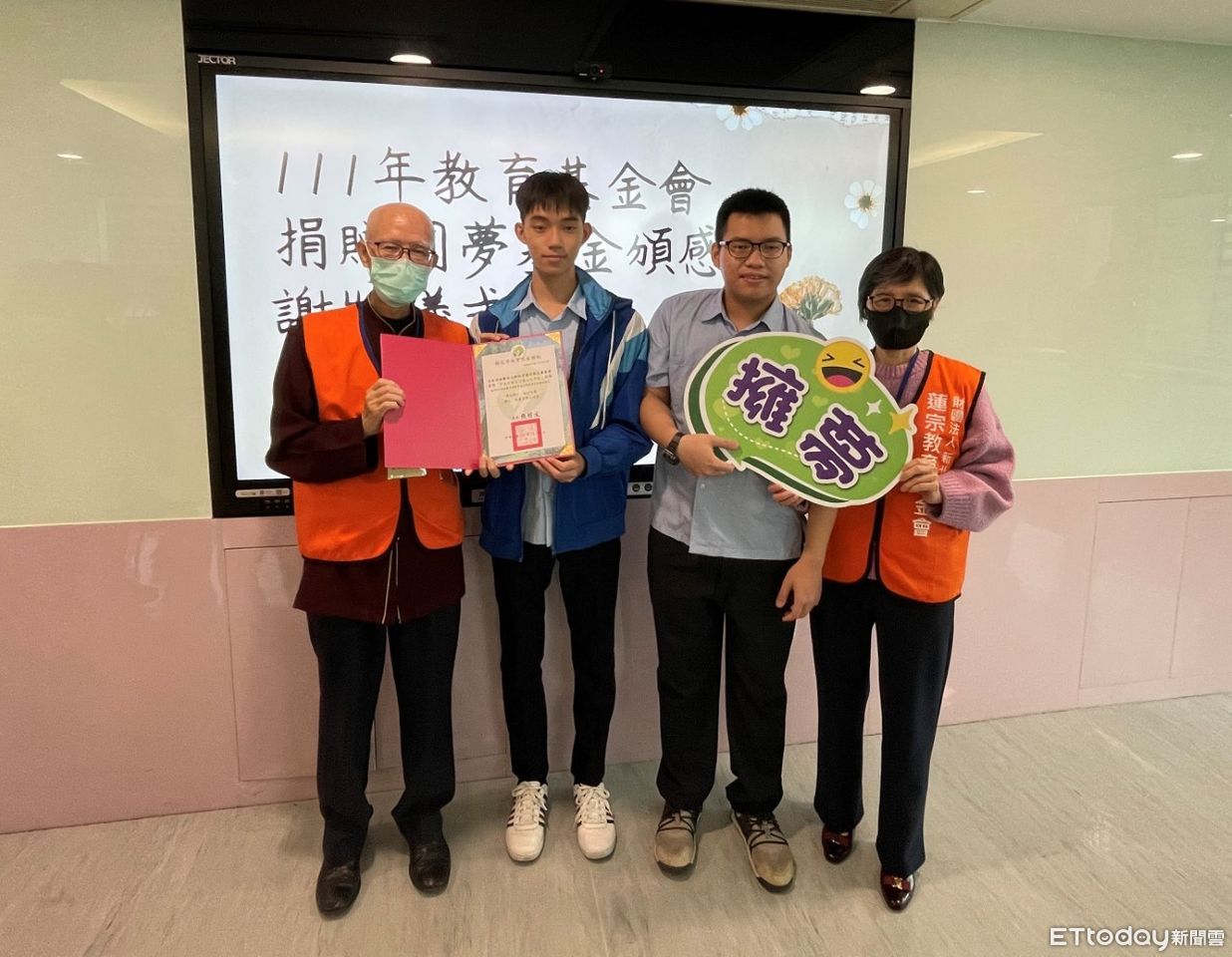 ▲板橋高中學生陳越宇(右2)及高帆(左2)參加捐贈儀式,與教育基金會代表合影。(圖/新北市教育局提供)