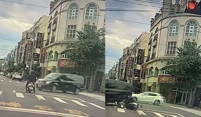 ▲騎士腳才剛放下就被廂型車撞倒。(圖/翻攝自爆料公社)