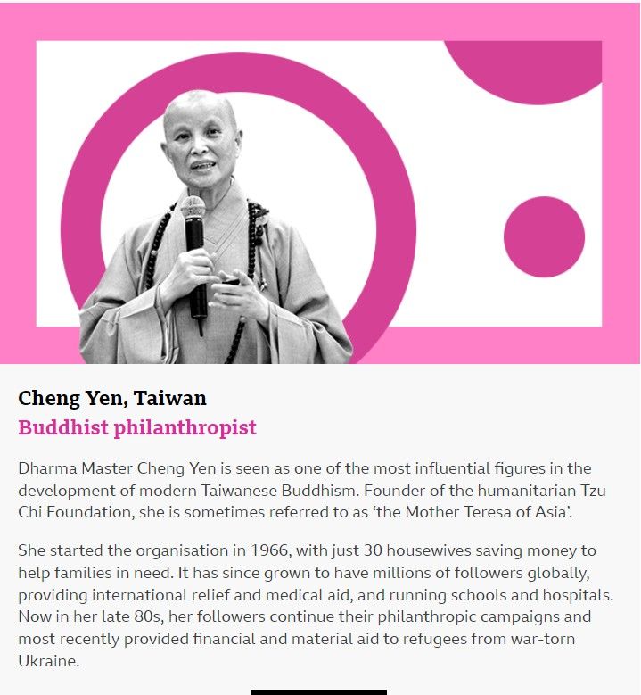 英國廣播公司(BBC)發布2022年全球最具啟發性與影響力的百大女性名單,台灣有創辦佛教慈濟基金會的證嚴法師入列。