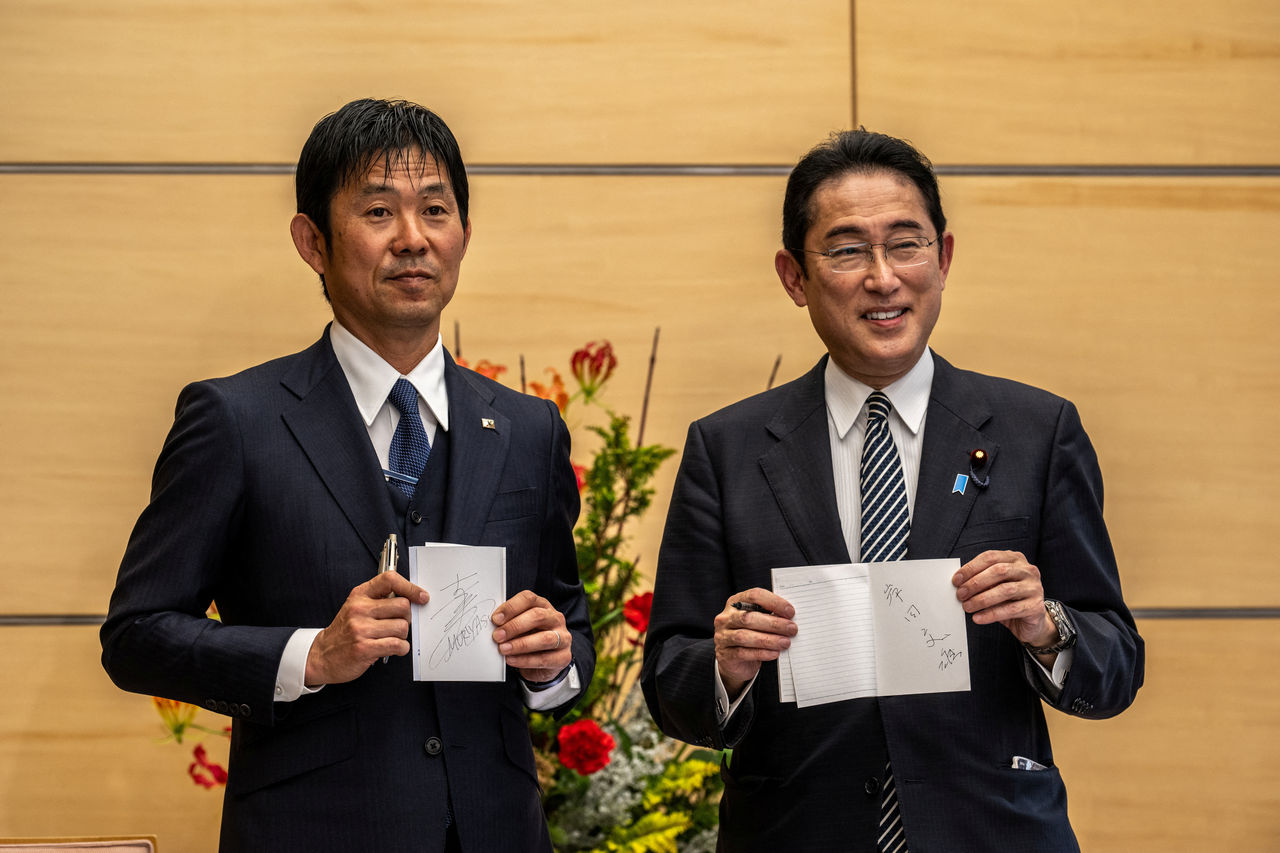 ▲日本足球國家隊教頭森保一與首相岸田文雄相互交換筆記本。(圖/路透)