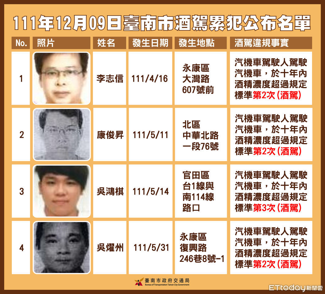 ▲台南市於9日公布第15批酒(毒)駕累犯名單,這次公布13名累犯違規人,累計已公布96人。(圖/記者林悅翻攝,下同)