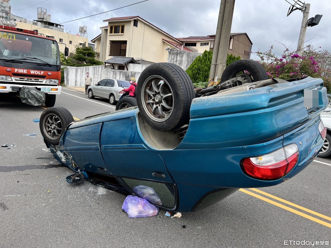 ▲苗栗縣竹南鎮建國路,9日中午發生一名婦人駕駛小客車疑似閃避小貓,失控撞擊停在路邊小貨車,小客車4輪翻覆在車道上,駕駛輕傷。(圖/記者蔡文淵翻攝)