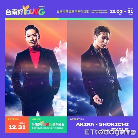 「台南好YOUNG」跨年晚會將於12月31日晚間在台南市政府永華市政中心西側廣場舉行,主持人為炎亞綸、徐凱希,除了今天壓軸揭曉的「AKIRA x SHOKICHI from EXILE」的特別組合,還有來自在日本TicTok締造5億次播放的偶像女團「FRUITS ZIPPER」,一個月衝台灣南北的韓國新世代偶像男團「EPEX」,以及炎亞綸、魏如萱、艾怡良、五堅情、造夢者樂團、孫盛希、麋先生、楊宇騰YU、Crispy脆樂團、艾薇、大支、Howz•莫凡新,更多現場與轉播相關詳情可洽「台南好YOUNG」臉書專頁。