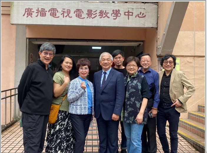 ▲ 世新大學校長陳清河(左四)邀請跨世代的校友們在廣電大樓前合影留念。