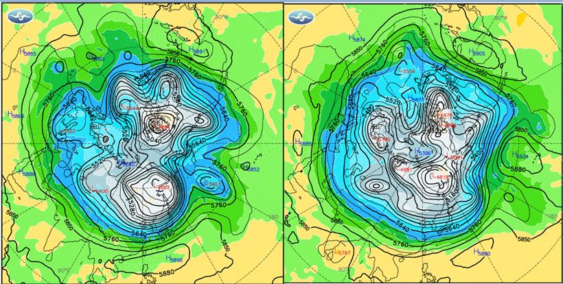 ▼左圖:1日8時中央氣象局北半球500百帕分析圖顯示,呈現2波的型態,「副熱帶高壓」偏強。右圖:9日8時中央氣象局北半球500百帕分析圖顯示,2波已轉為3、4波(右圖),「副熱帶高壓」仍偏強。(圖/三立準氣象· 老大洩天機)