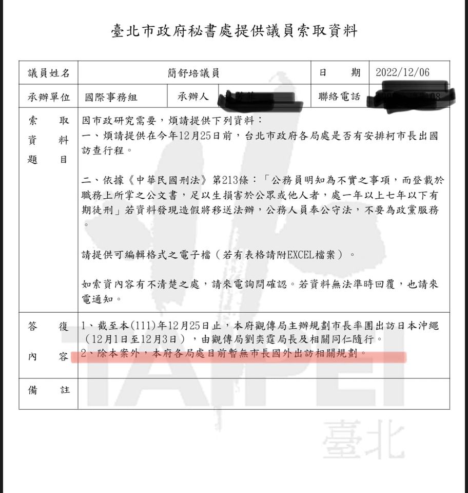 不過,此說法簡舒培並不買單,於臉書貼出北市府公文,批評柯文哲雖說出訪是1年前就排定,但12月6日台北市政府回覆的公文說市長除了去日本沖繩,「沒有其他出訪計畫。」