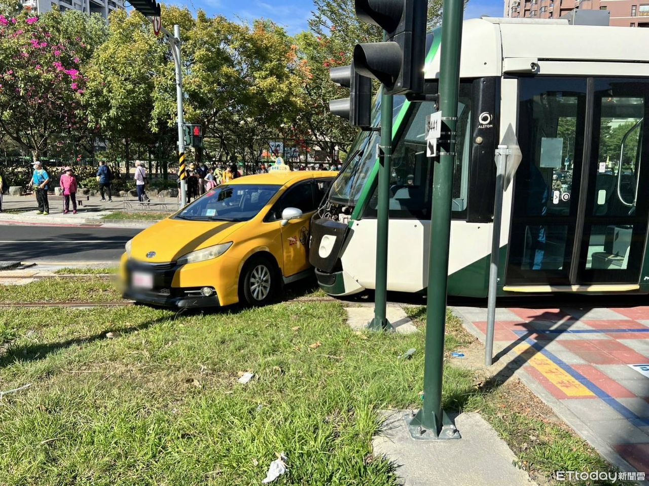 高雄輕軌2天前才發生一起死亡車禍,不料,今(11日)下午一輛計程車於鼓山區大順一路、南屏路口迴轉,不慎與輕軌列車發生碰撞。而撞擊瞬間也被監視器完整拍到,計程車至少被推撞10公尺才靜止,同時號誌燈也被輾壓在地,所幸事故沒有造成人員受傷。