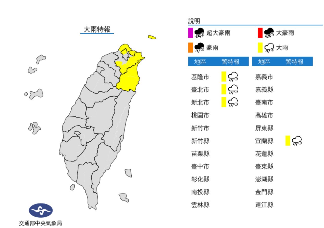 大雨:基隆北海岸、臺北市山區、新北市山區、宜蘭縣