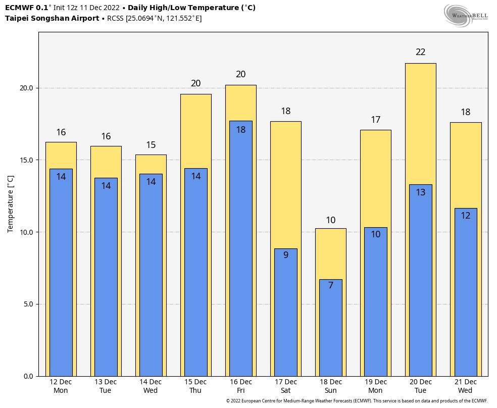 周末到下周一(12/17~12/19)冷空氣有機會達寒流強度,天氣職人吳聖宇今在臉書上表示,根據預報模式直出(未校驗調整)結果,台北有可能出現7度到9度低溫,天氣型態先濕後乾,周四到周五(12/15~12/16)冷空氣前鋒面發展通過,各地有雨,中北部高山視降溫條件,不排除有局部固態降水包括雪、冰霰、冰珠等發生機會。