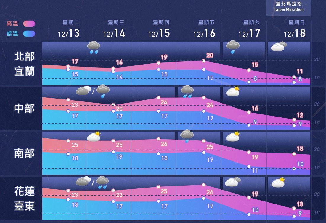 天氣風險表示,依照目前預報資料來看,各地從周六白天開始就會明顯降溫,最低溫時間點會落在當天晚間到周日清晨,空曠地區另要留意雲量偏少下,會有輻射冷卻的加乘效應,不排除有「極端低溫」出現的機會: