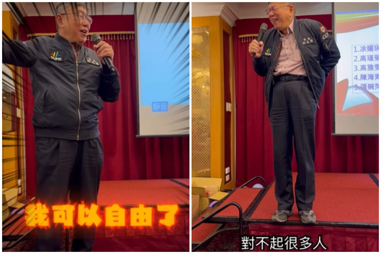 台北市長柯文哲12月25日即將卸任,12日晚間參加市府秘書處尾牙,一上台就向大家道歉,自嘲自己對不起很多人,希望大家原諒他,還忘情高歌《囚鳥》,更自爆他這麼多年來都不能講想講的話,「下禮拜看我怎麼K那個XXX(被消音)」,笑說不用當市長,「我可以自由了!」