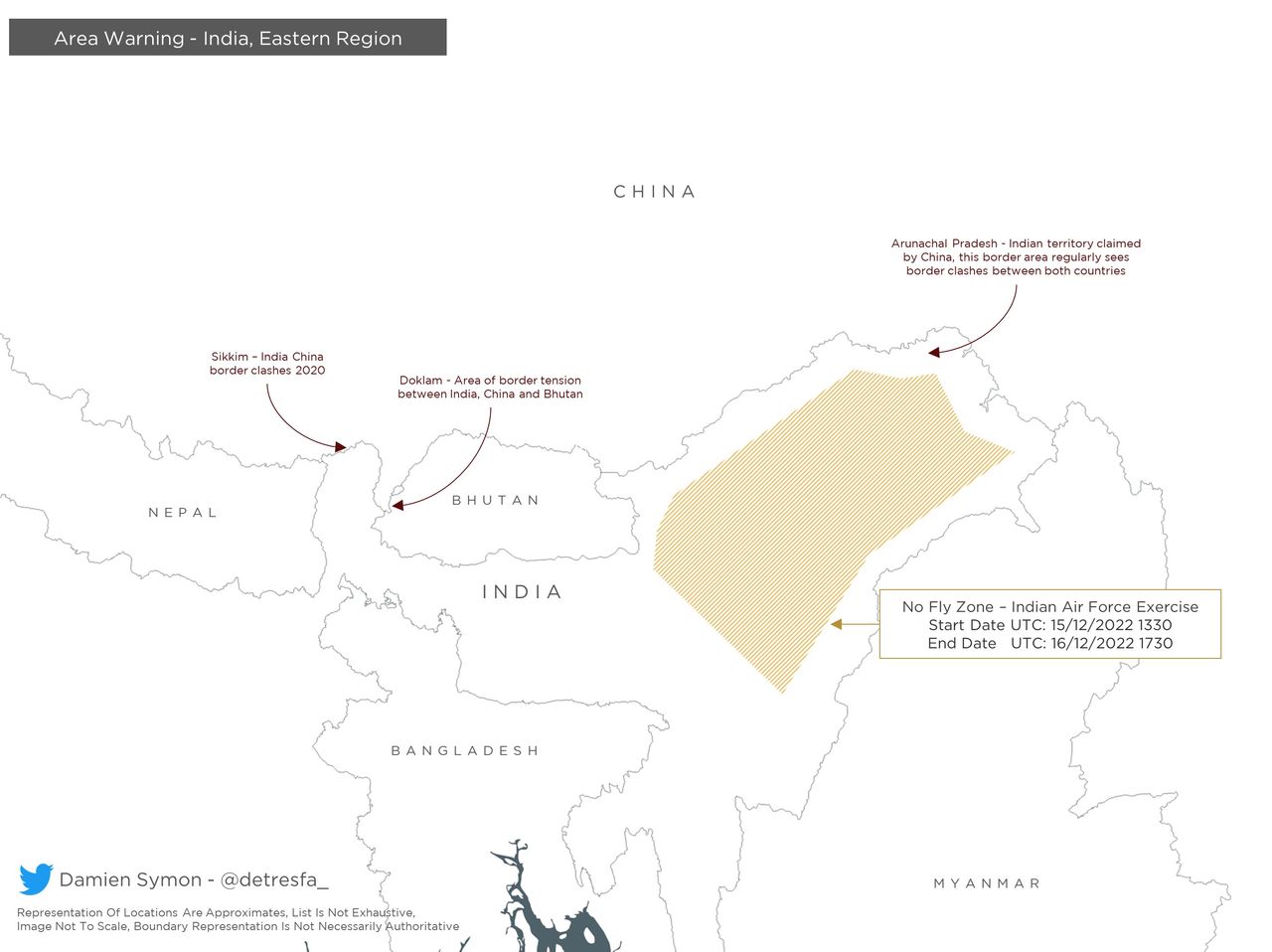 ▲印度空軍將在「藏南地區」軍演,畫設一大片禁航區。(圖/翻攝自@detresfa_)