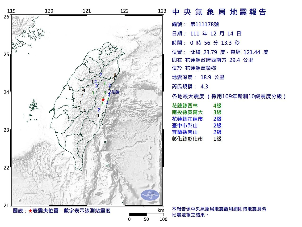 花蓮縣14日凌晨0時56分發生規模4.3地震,震央位於花蓮縣政府西南方29.4公里、花蓮縣萬榮鄉,地震深度18.9公里,最大震度為花蓮4級。