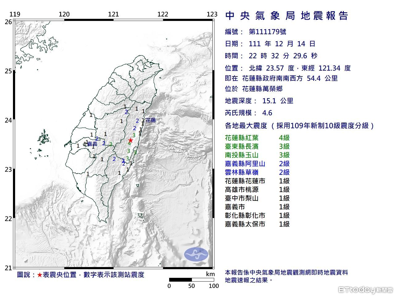 台灣14日晚間10時32分發生規模4.6地震,震央位於花蓮縣政府南南西方54.4公里、花蓮縣萬榮鄉,深度為15.1公里,最大震度4級。
